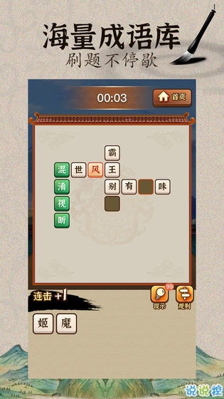 这款成语游戏,玩法简单又有趣。游戏开始后,屏幕上会随机出现一个提示词,你需要根据这个提示词,在规定的时间内,找出对应的成语。比如,提示词是“一马当先”,你就要迅速想到“一马当先”这个成语。