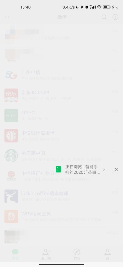 首先,我们来看看微信页面的顶部。那里有几个图标,分别是“微信”、“通讯录”、“发现”和“我”。这些图标就像微信的四大板块,分别负责不同的功能。